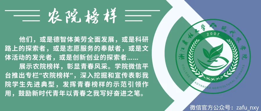 智慧农业221班学生,曾担任班级学习委员、EPA就业与实践发展协会实践拓展部干事,现任EPA就业与实践发展协会副会长兼就业拓展中心主任、大学生未来领军者协会核心能力主任。